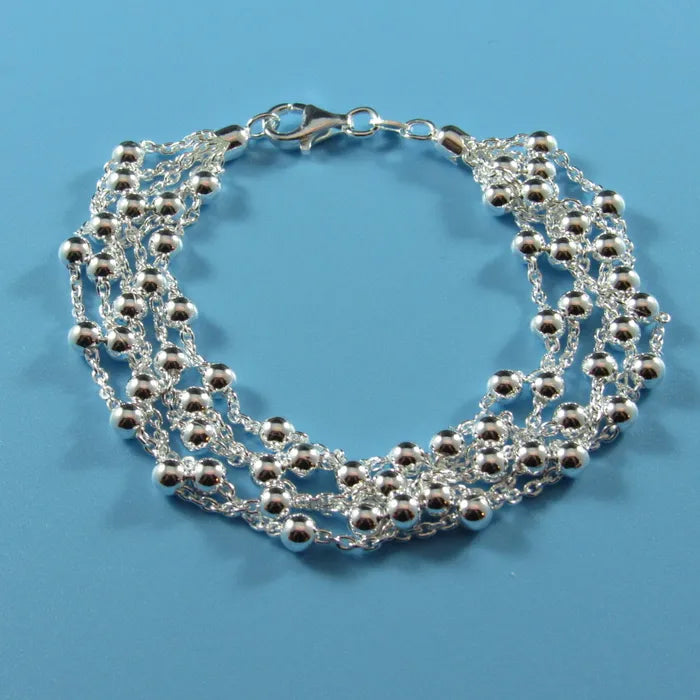 Sterling silver five strand beaded bracelet with lobster clasp and rhodium plating.