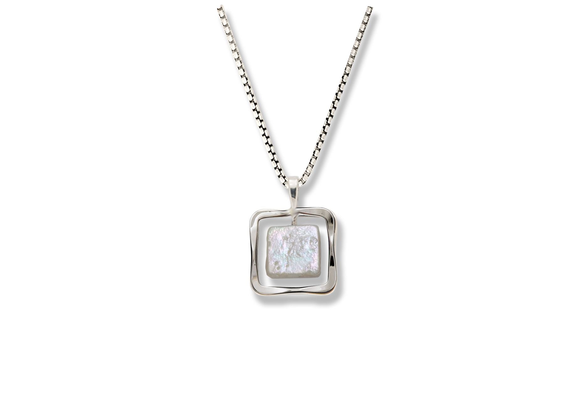 A square stone inside a square polished frame -a simple design with synergy! The beach, the office, or a night on the town are all fitting venues for this lovely pendant on snake chain. Matches Zenith earrings. By E.L. Designs.