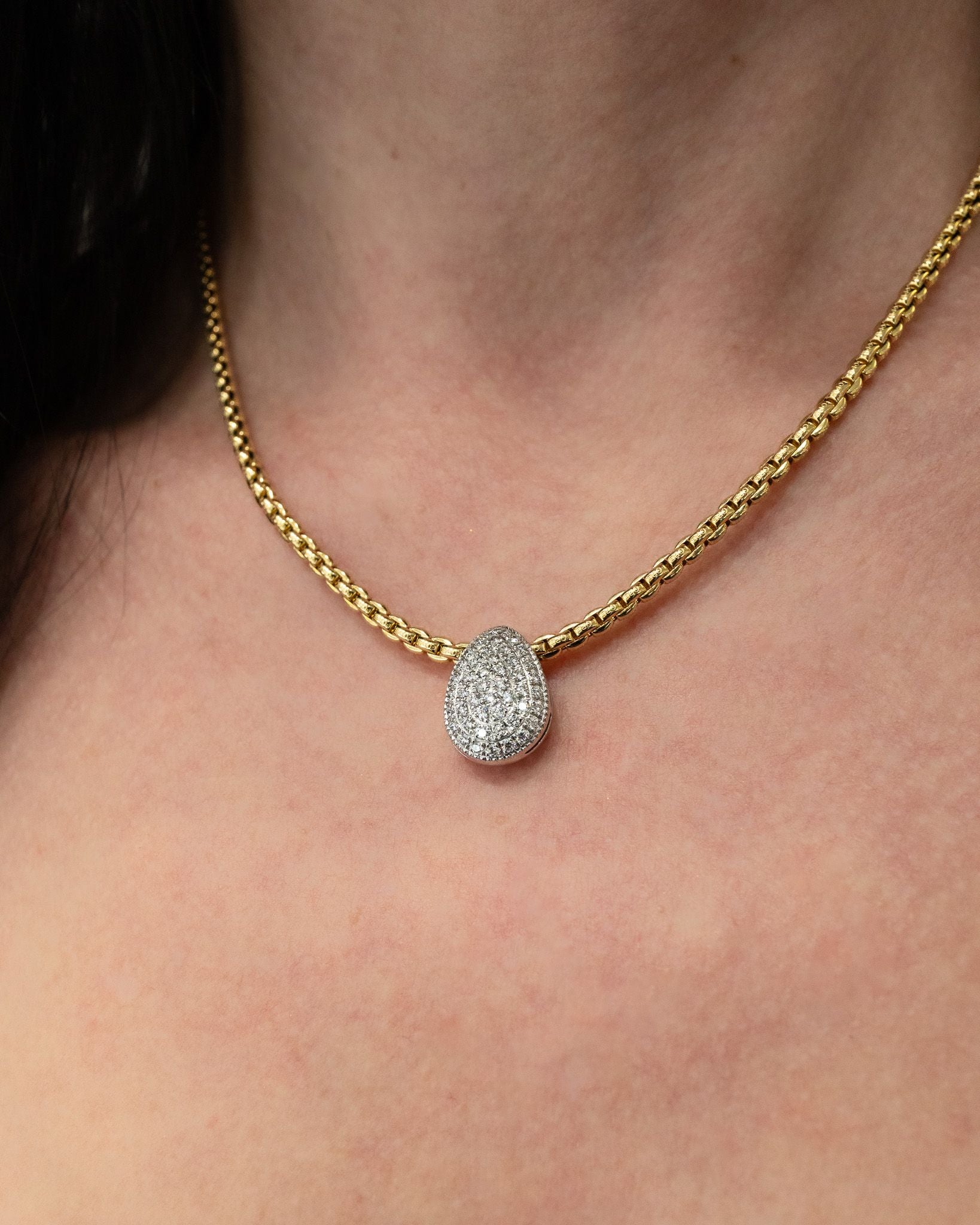 Necklace entirely made of 18K yellow gold with white gold diamond pave teardrop.