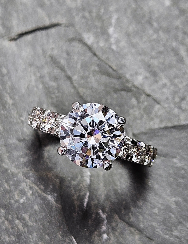 This beautiful round solitaire diamond engagement ring shines with pave diamonds along the shank