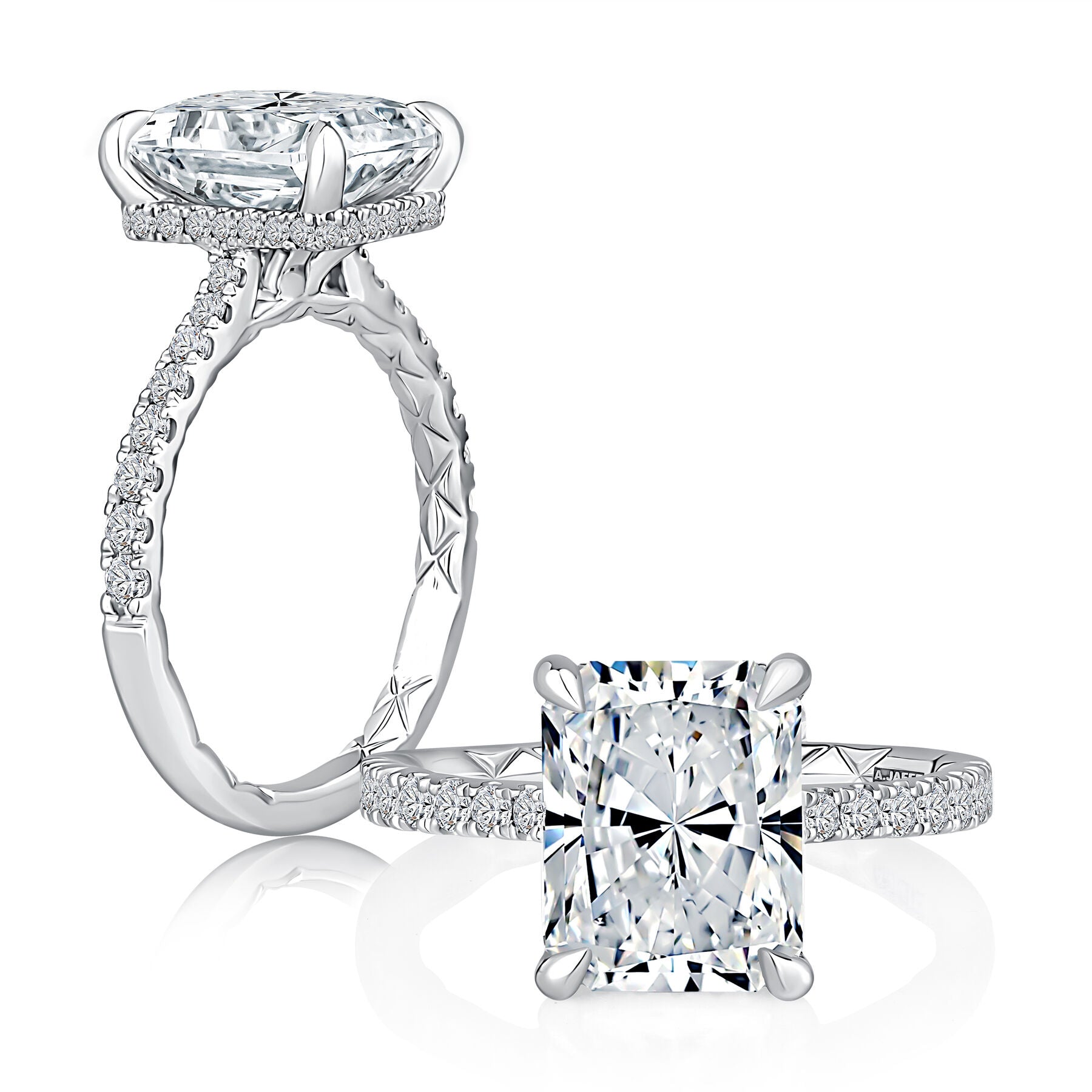 This elegant four prong set engagement ring features a radiant cut center diamond with hidden halo and diamonds on the shank.