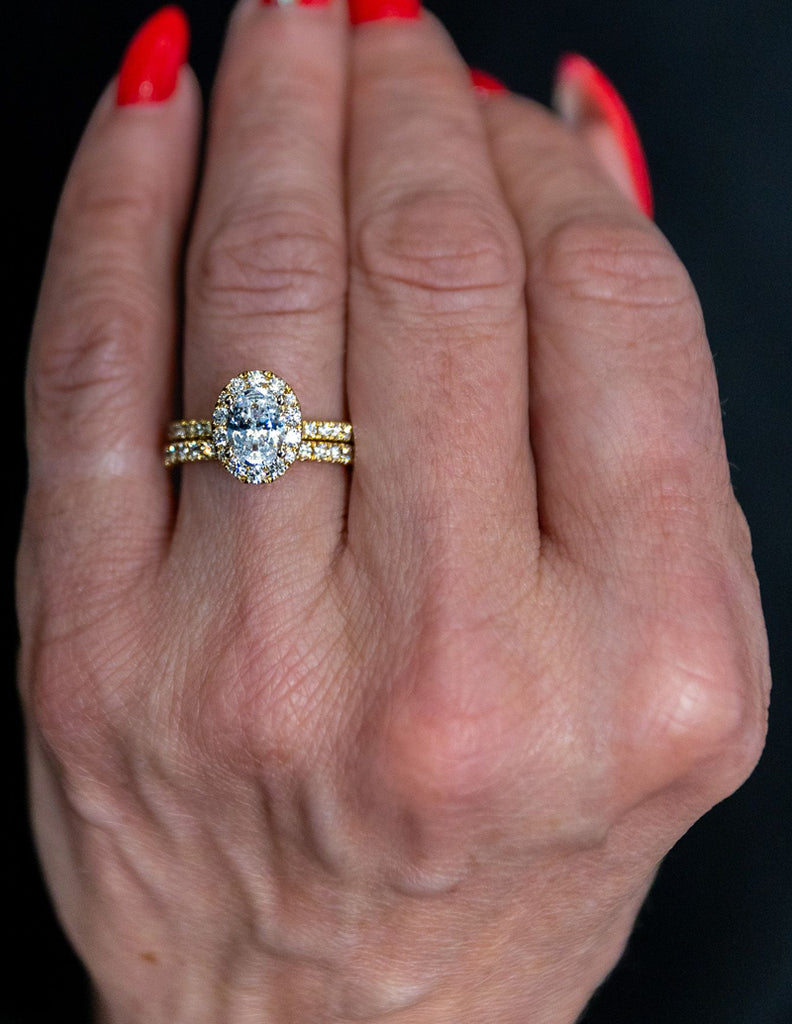 This four prong oval engagement ring showcases an oval center in a halo setting. The band features a classic quilted interior that helps prevent the ring from spinning and facilitate airflow for a premium fit. Made for the modern bride, this is a sophisticated way to wear the halo trend.