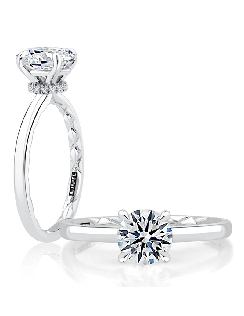 This elegant four prong set engagement ring features a classic round cut center diamond. The solitaire setting of this ring has an additional ring of secret sparkle.