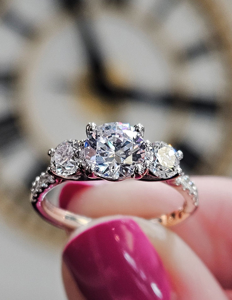 This engagement ring features a three stone trellis design. With a round cut center diamond, this ring defines luxury and class. This diamond engagement ring also features a true diamond pave diamond band which is guaranteed to give the ring a timeless look.