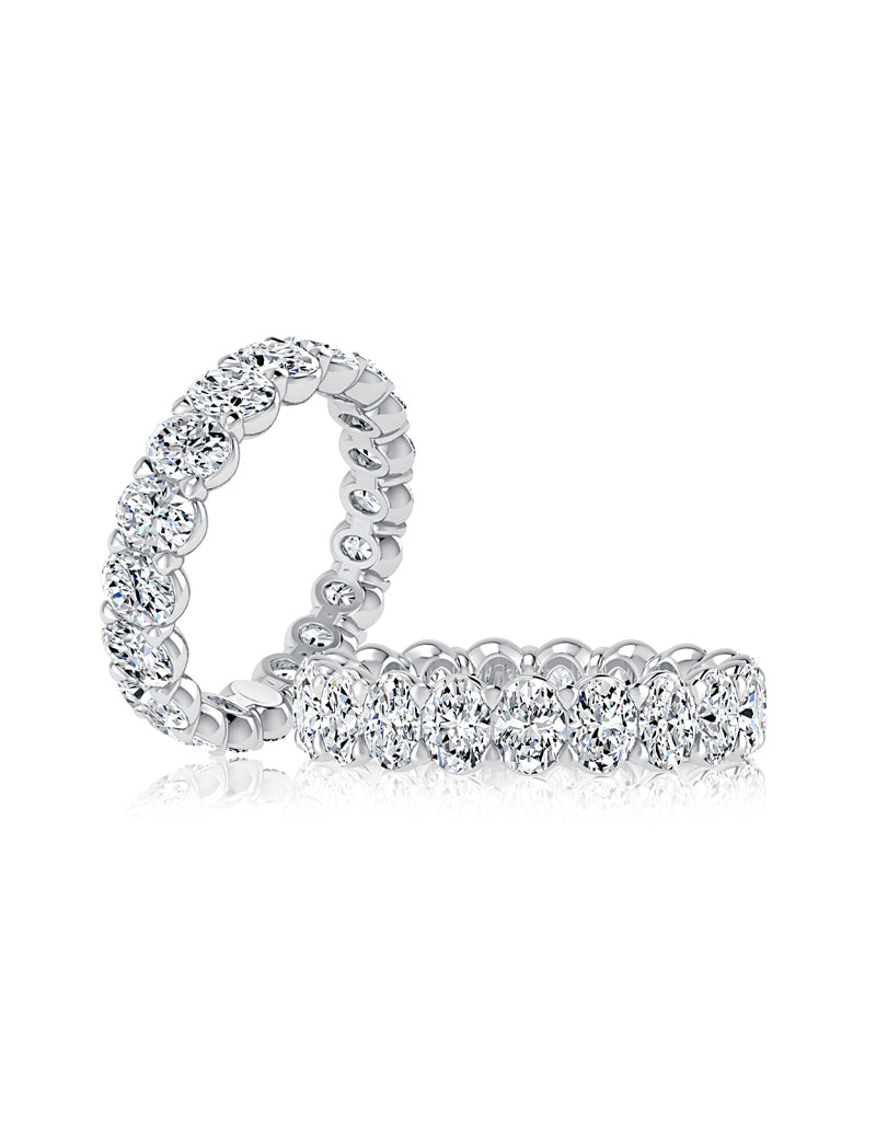 This stunning eternity band has oval diamonds running all the way around, side to side with a shared prongs.