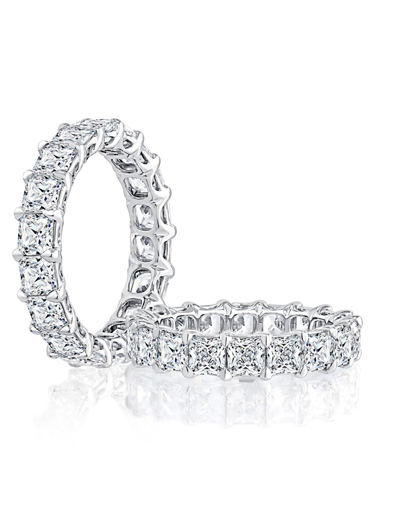 Prong set princess cut diamond eternity band. This beautiful diamond band is perfect for the modern bride who prefer a classic and neat look.