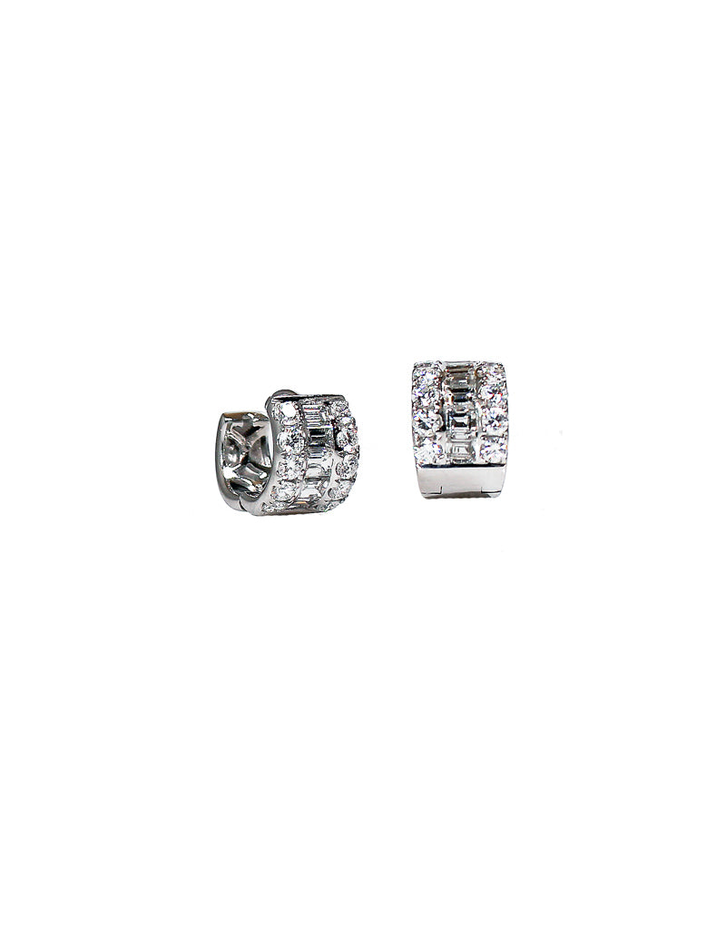 14K white gold diamond huggies with three rows of diamonds and hinge closure.