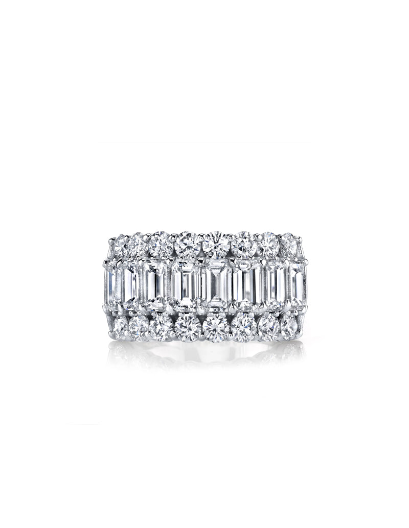 18K white gold three row diamond ring featuring a center row of emerald cut diamonds surrounded by round diamonds.