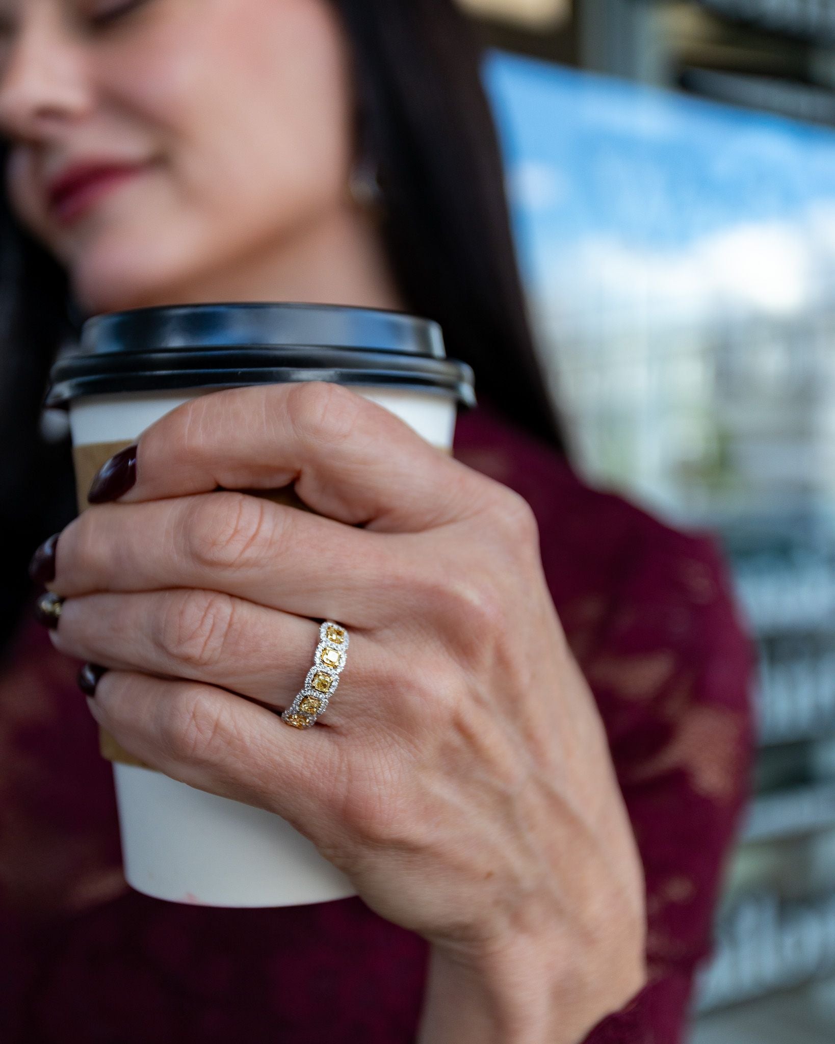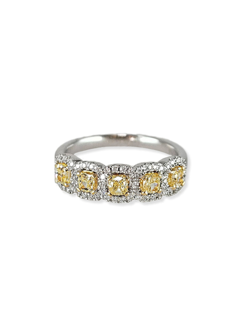 14K white gold band with five square yellow diamonds in contrast with halos of white diamonds.