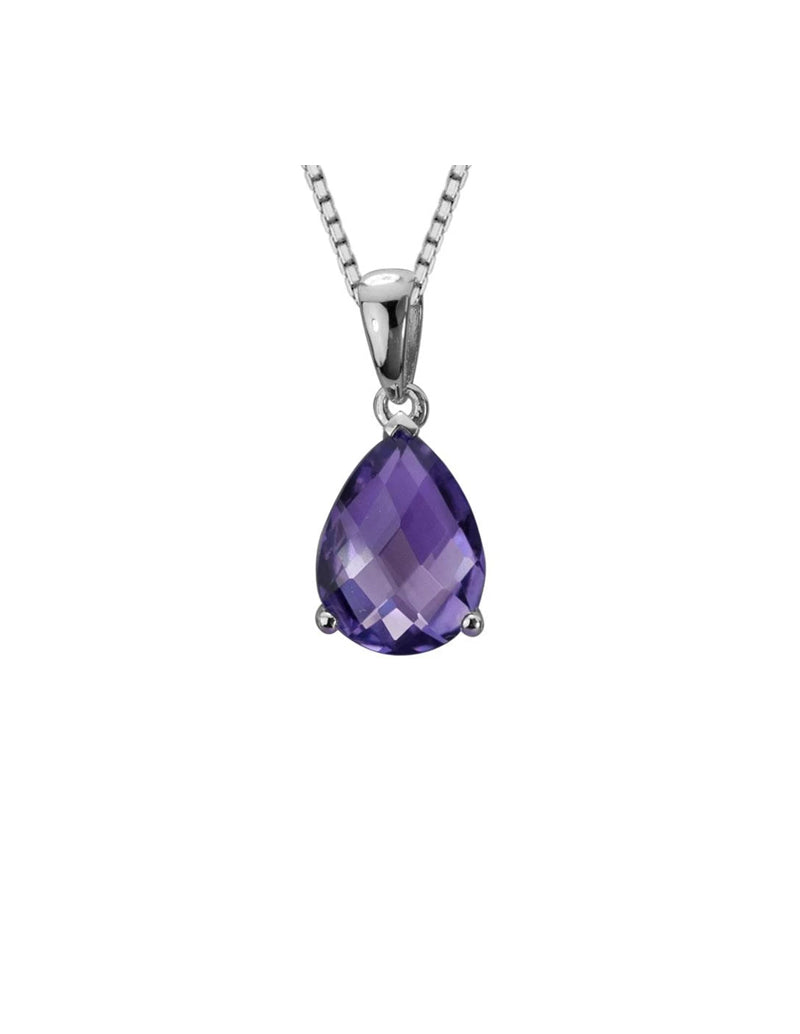Sterling silver checkerboard pear shaped amethyst pendant on adjustable cable chain.