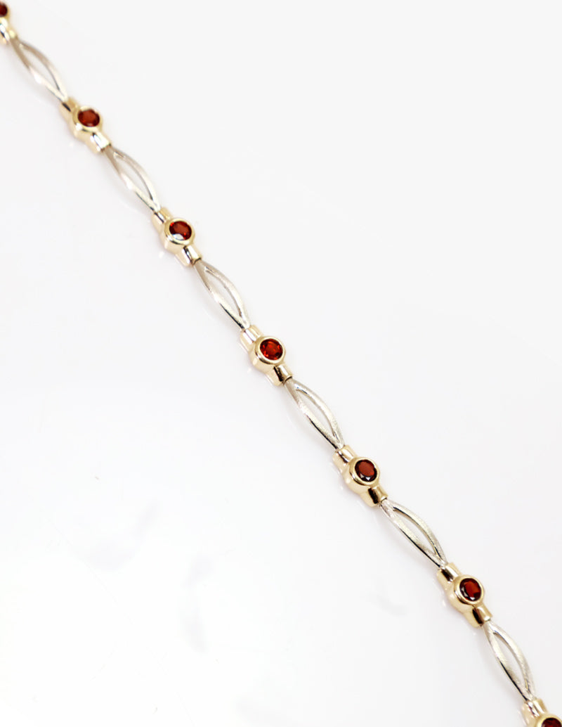 Bezel set garnets in 14K yellow gold connected by 14K white gold bars.