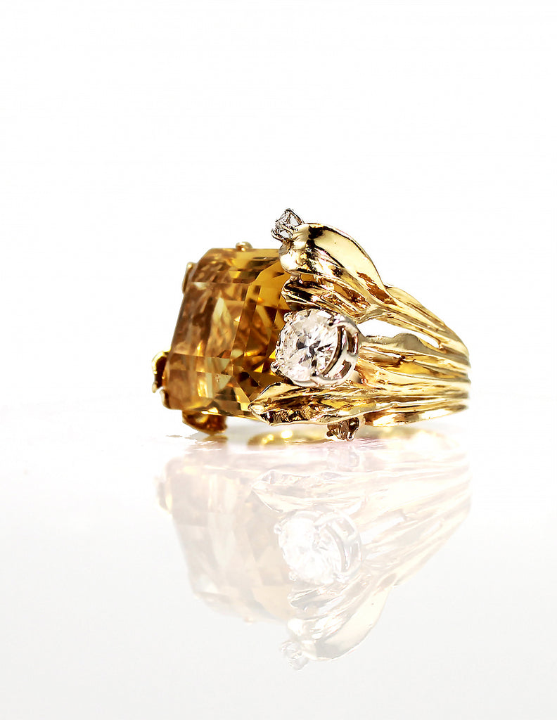 14K yellow gold, emerald cut citrine, diamond accents set in a leaf motif.