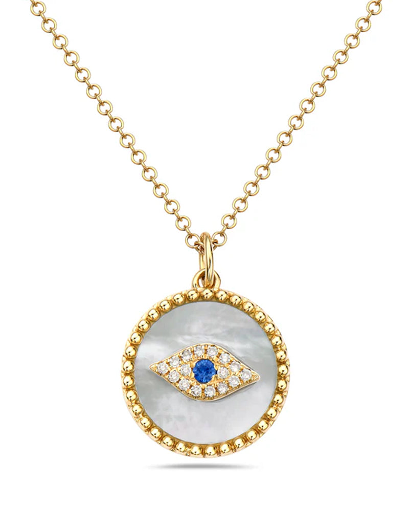 14K yellow gold evil eye pendant with mother of pearl, diamonds, and sapphire on adjustable cable chain with lobster clasp.