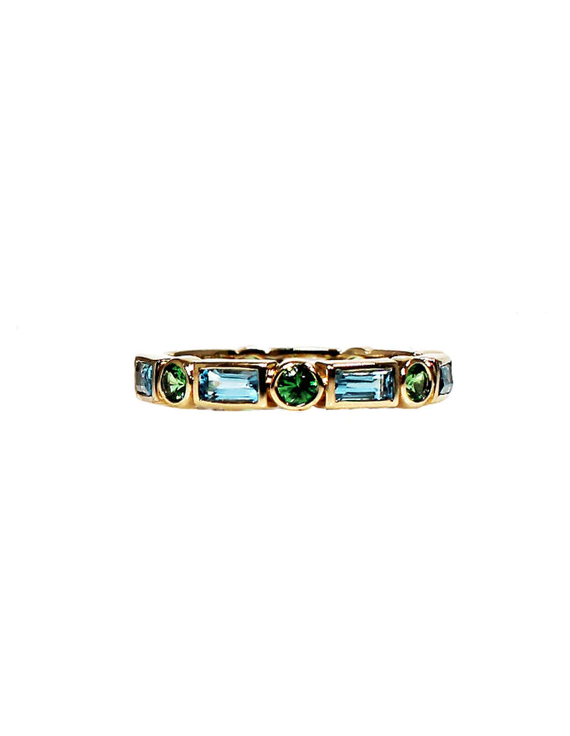 14K yellow gold band with bezel set blue topaz baguettes and round tsavorites.