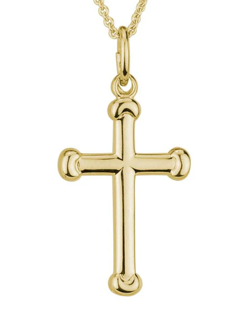 Priced in 14K yellow gold, 18mm cross, 0.9mm chain, 16-18".