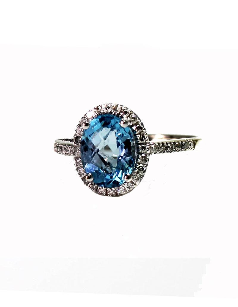 14K white gold, oval blue topaz, with 37 diamonds around and diamonds in shoulder of shank.