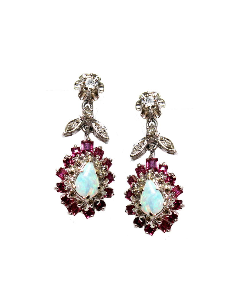 14K white gold with pearl shaped opals, square rubies and diamond accents.