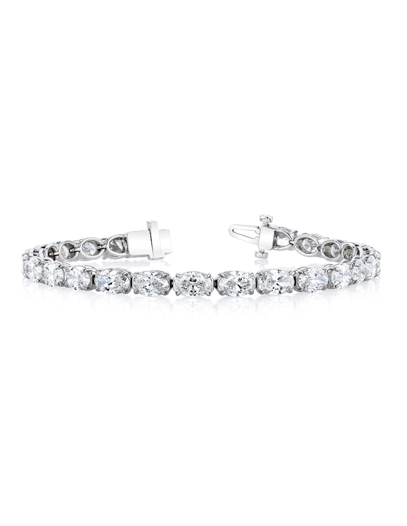 18K white gold east west set oval diamond tennis bracelet with safety clasp.