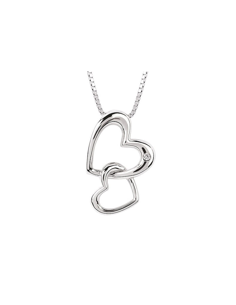 Sterling silver double heart pendant with diamond accent on adjustable box chain with lobster clasp.