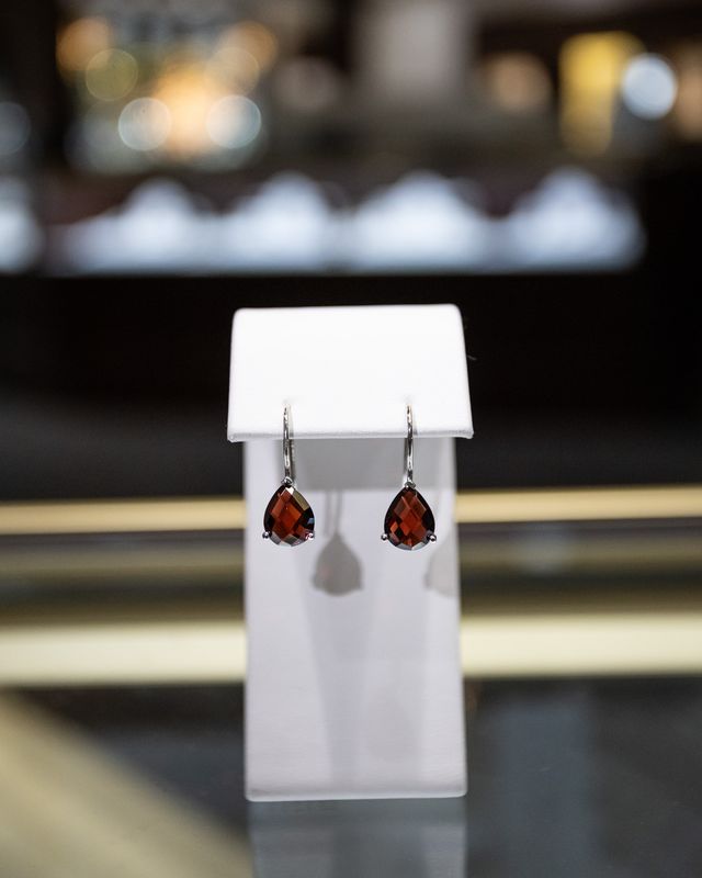 Sterling Silver checkerboard pear shaped garnet dangle earrings.