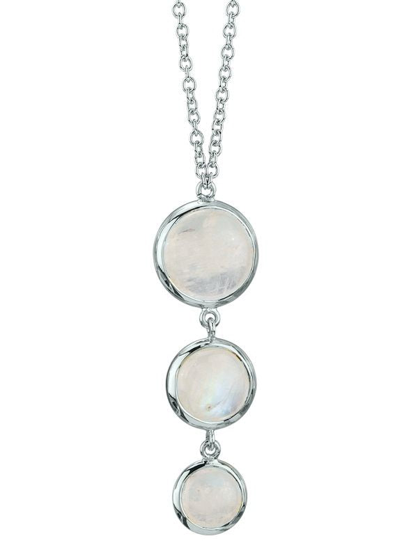 Sterling silver graduate bezel set rainbow moonstone pendant on adjustable chain with lobster clasp.