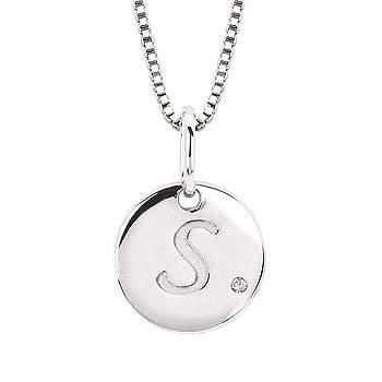 Sterling silver letter 'S' disc pendant with diamond accent on box chain with lobster clasp.