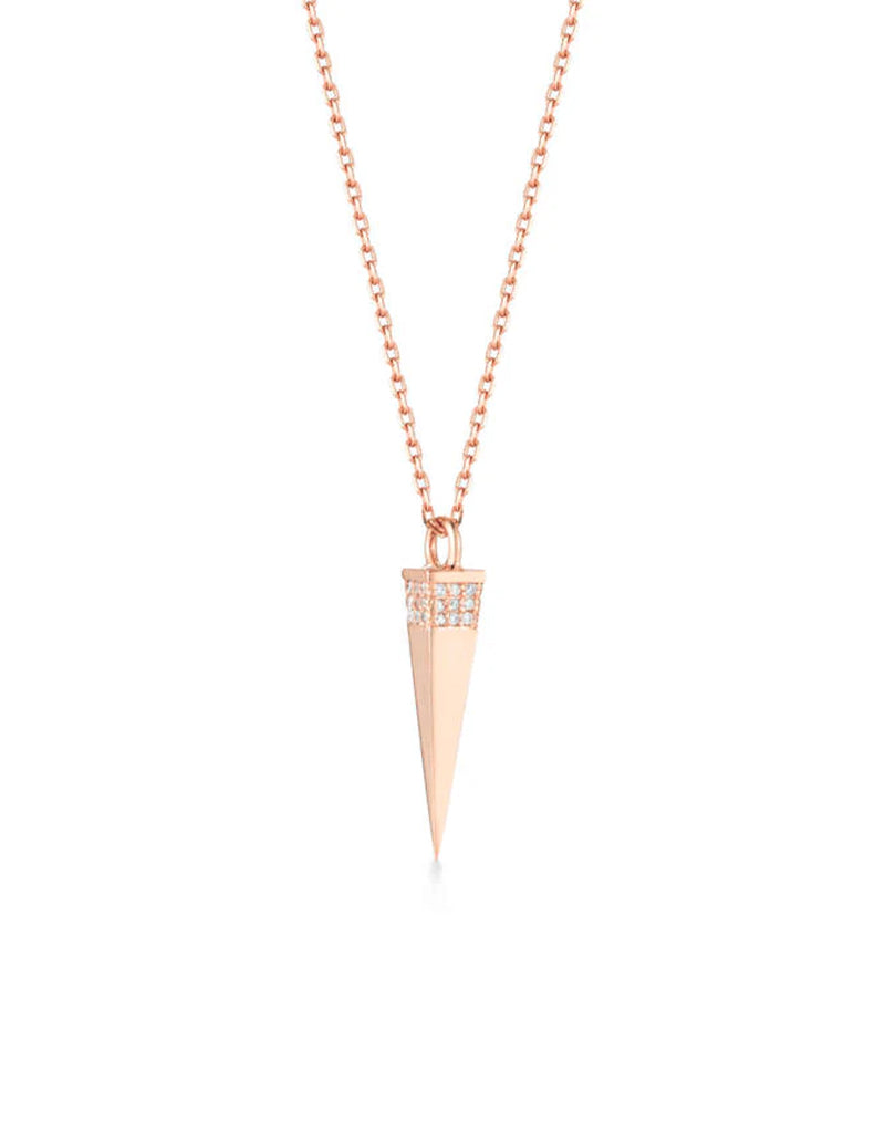 14K rose gold Aztec necklace with diamonds on spike on cable chain with lobster clasp.