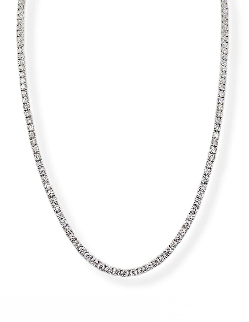 14K white straight line diamond tennis necklace with safety clasp.