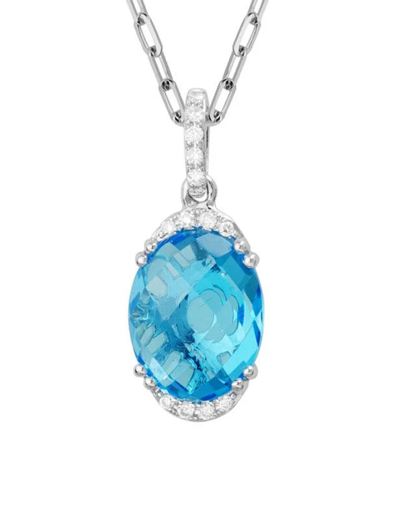 14K white gold oval checkerboard blue topaz pendant with partial halo and diamond bail on diamond cut chain with lobster clasp.