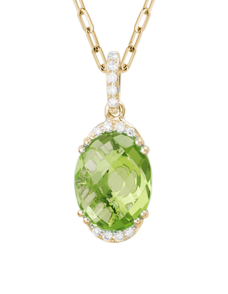 14K yellow gold oval checkerboard peridot pendant with partial halo and diamond bail on diamond cut chain with lobster clasp.