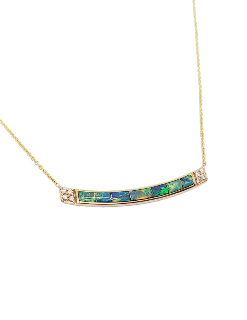 14K yellow gold Kabana bar pendant with inlaid opal and diamond accents on cable chain.