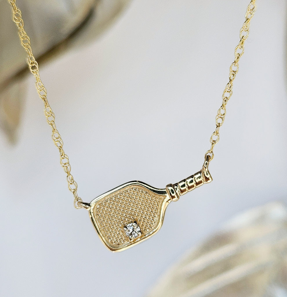 14K yellow gold pickle ball pendant with diamond accent on attached rope chain with spring ring closure.