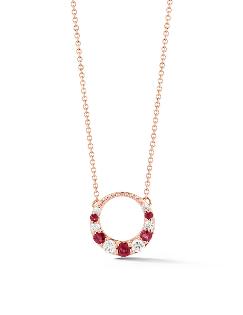 14K rose gold ruby and diamond Jessa necklace with lobster clasp.