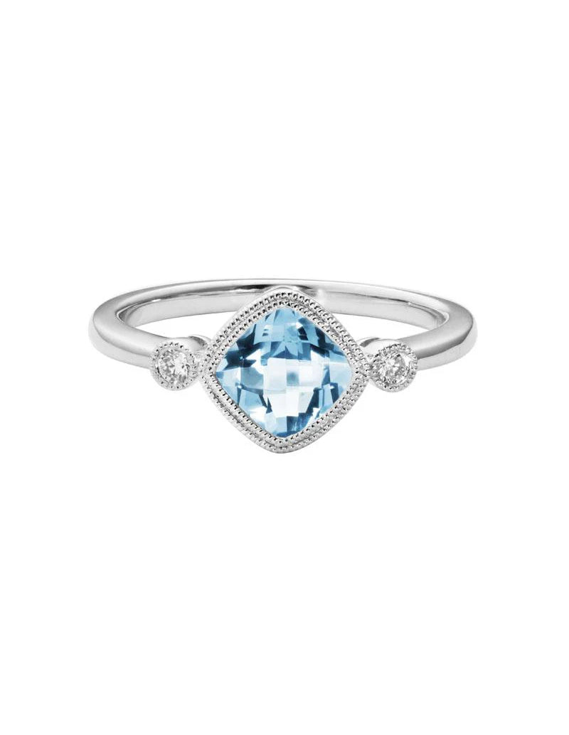 14K white gold cushion cut aquamarine set in a millgrain bezel ring with diamond accents.