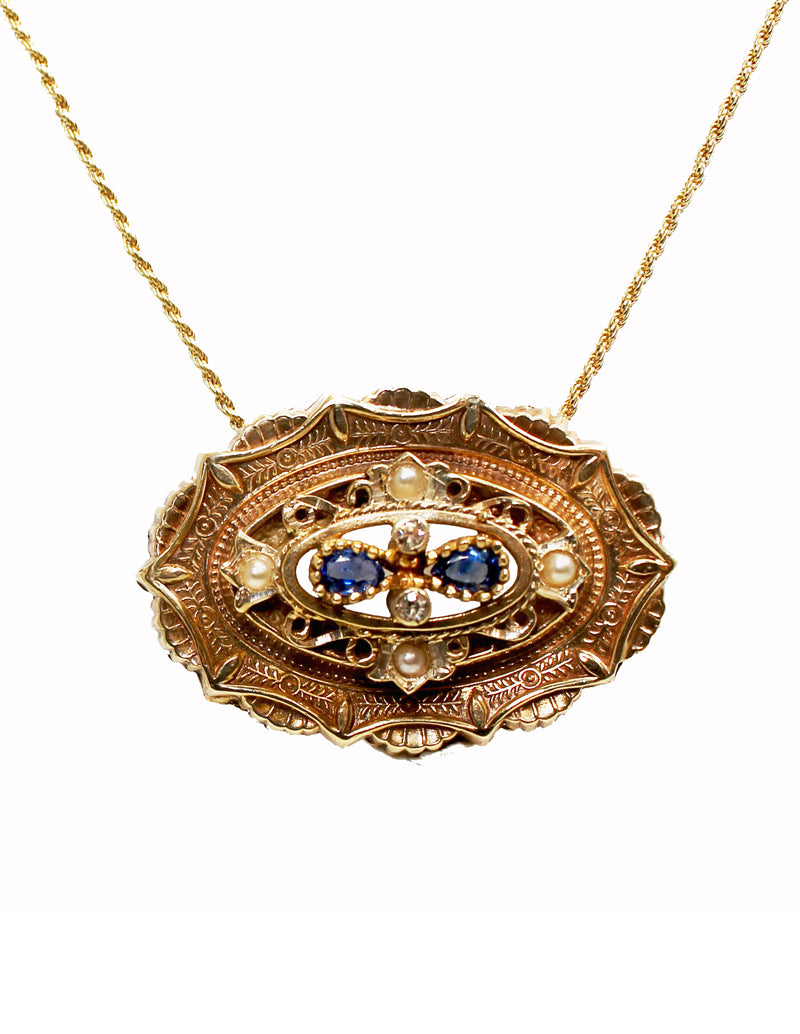 14K yellow gold sapphire with pearl and diamond accents; engraved detail.