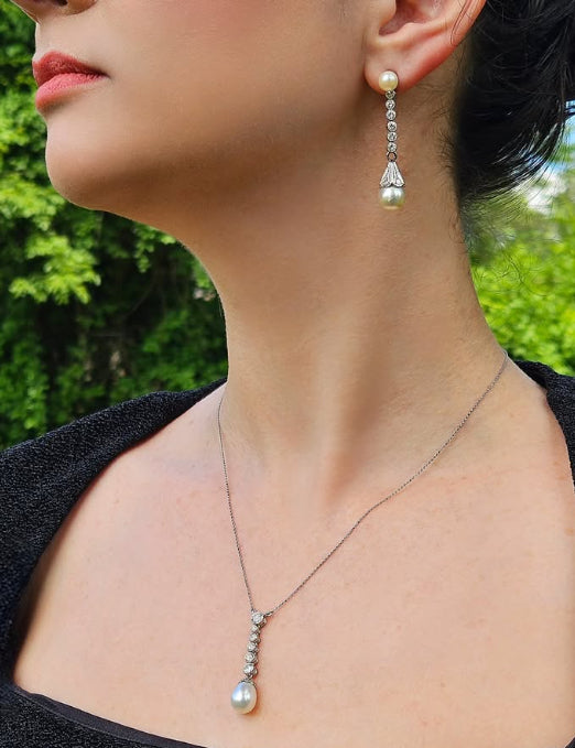 platinum diamond and pearl drop pendant, with 6 round diamonds, and on natural peral, circa 1920.