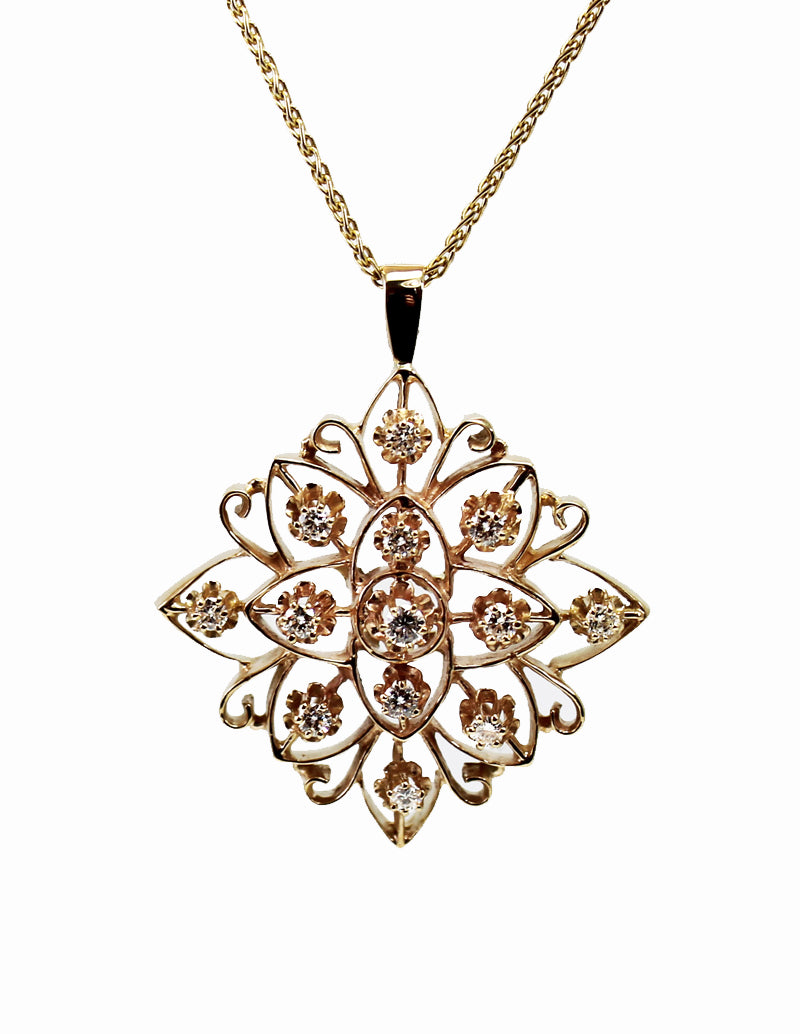 14K yellow gold with round diamonds set in an open, scroll-work design.