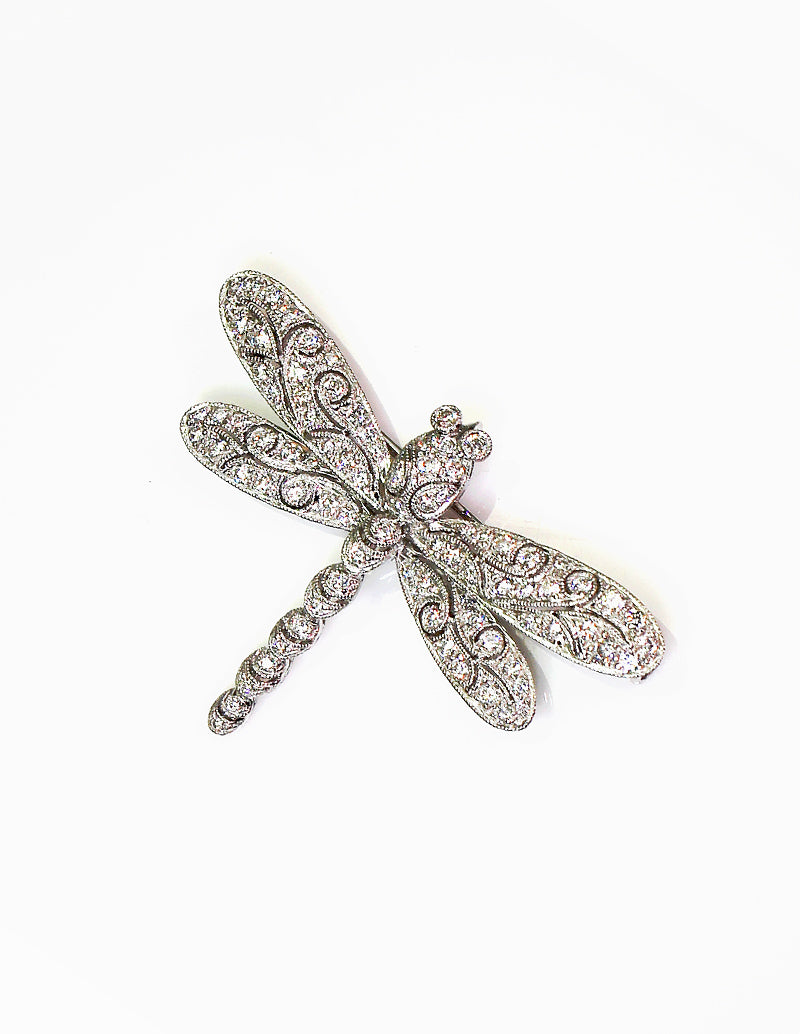 18K white gold, pave diamond dragonfly with filigree and millgrain detail.