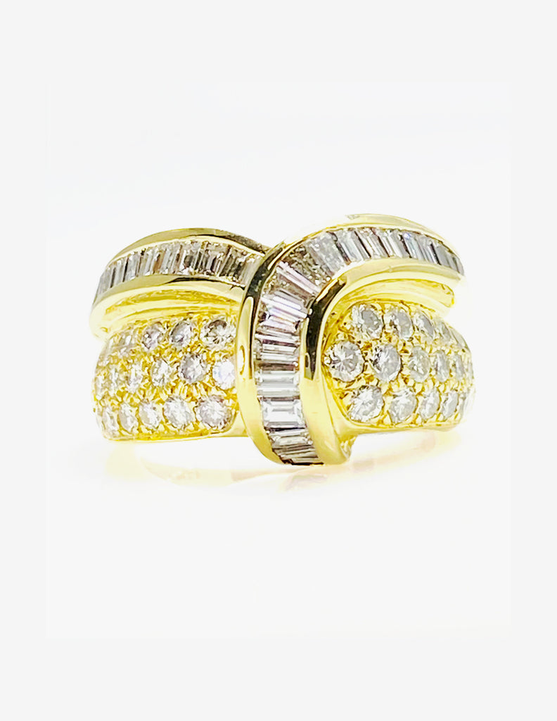 18K yellow gold, large pave diamond band, with 36 fc diamonds and 31 baguette diamonds.