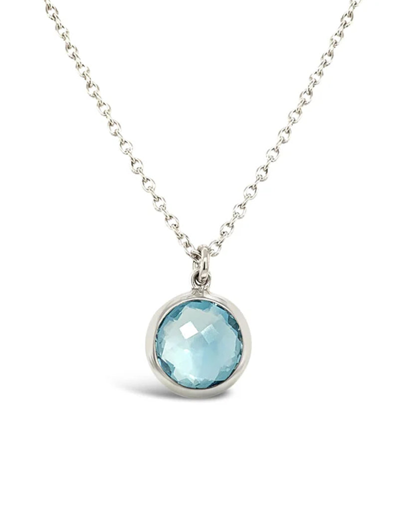 Sterling silver bezel set blue topaz pendant with adjustable chain with lobster clasp.