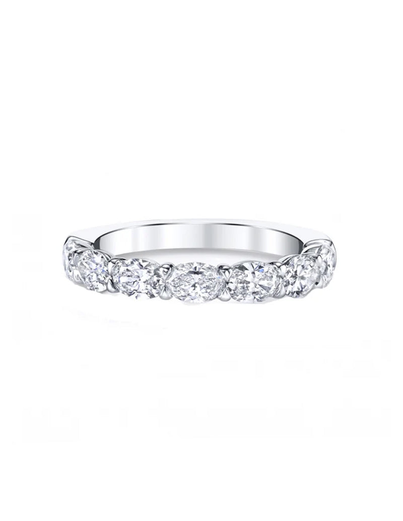 18K white gold wedding band with horizontal set oval diamonds halfway around.