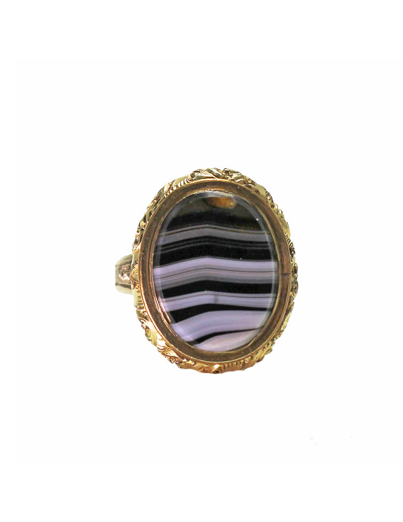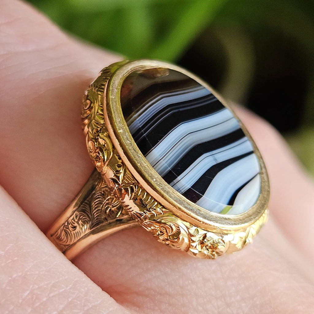 14K yellow gold, with bezel set black and white agate in ornate frame.