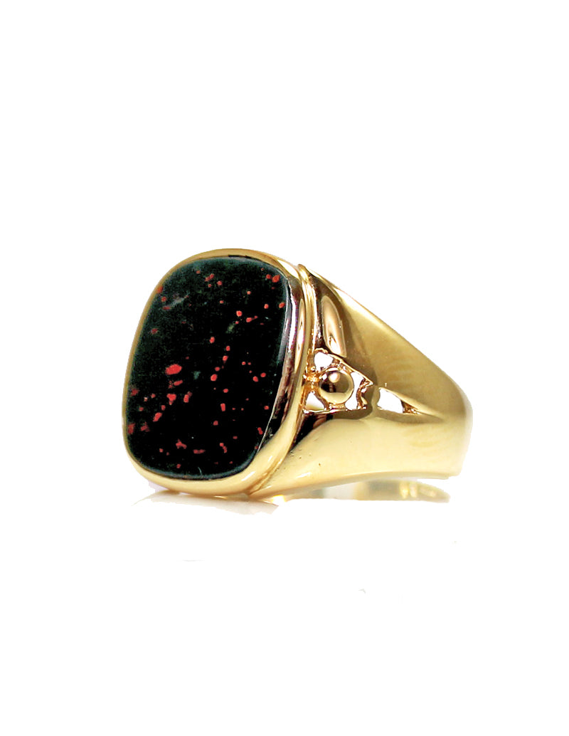 14K yellow gold with 12mm cushion shaped bloodstone.