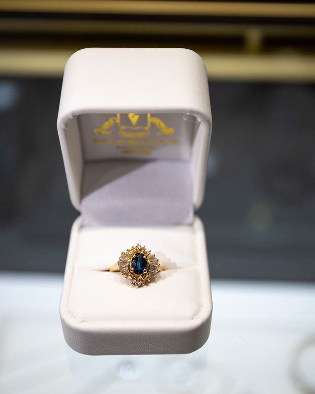 14K yellow gold, Blue sapphire with 10 diamonds.