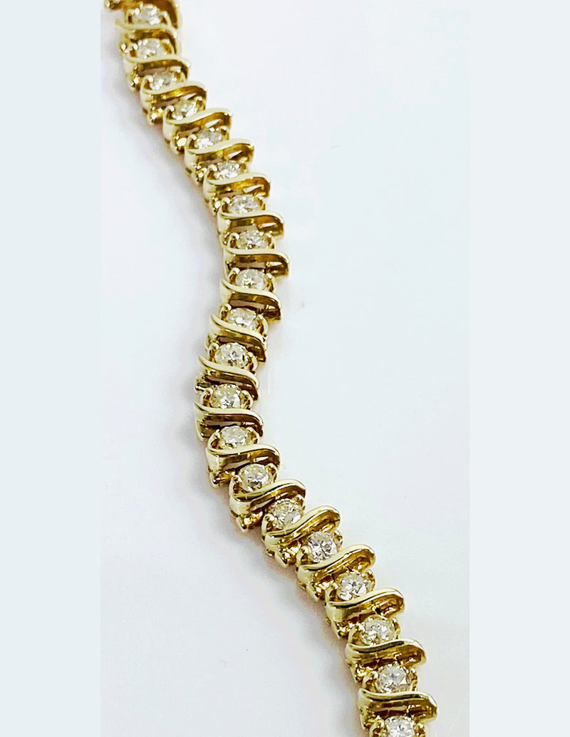 14K yellow gold diamond tennis bracelet with 's' shaped links each set with a diamond.