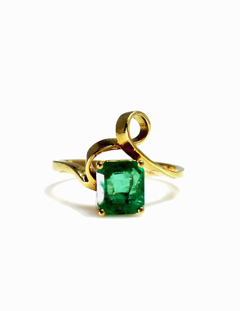 18K yellow gold, free-form twisted shank, with emerald cut emerald. circa 1975