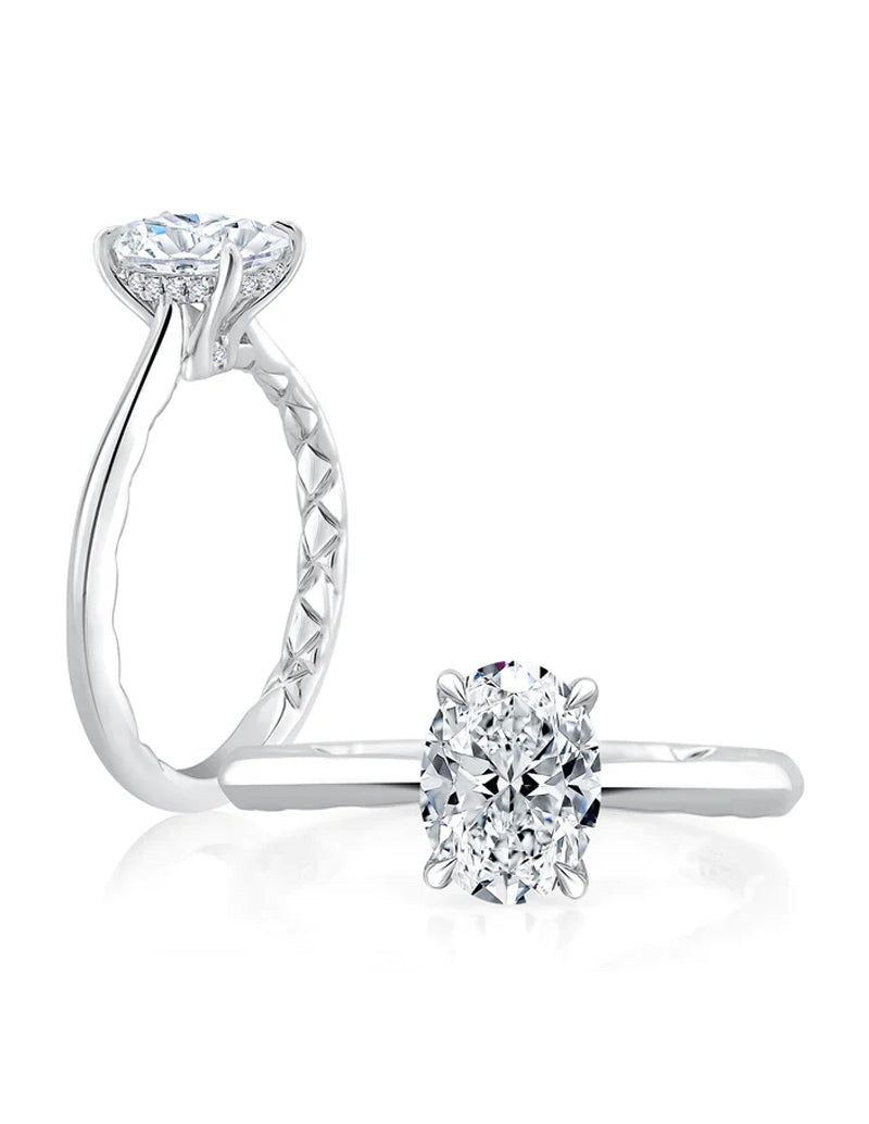 This oval solitaire is 4 prong and has a quilted interior.